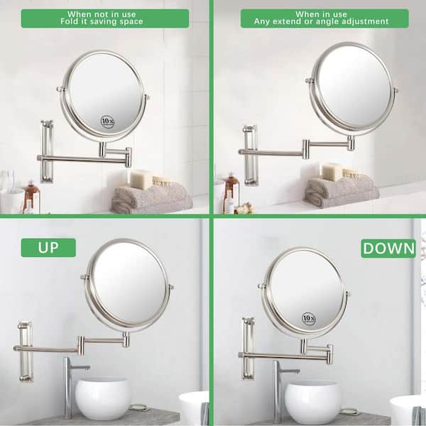 8 in. W x 8 in. H Round Framed Brushed Nickel Mirror, 1x / 10 x Magnification Mirror, 360° Swivel with Extension