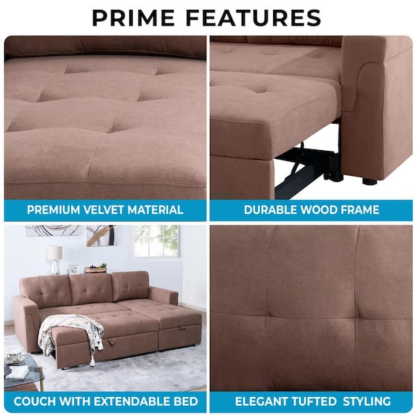 84.64 in. Velvet L-Shaped Sleeper Sectional Sofa with Square Arms in. Mocha, Reversible Chaise and Pull-Out Bed