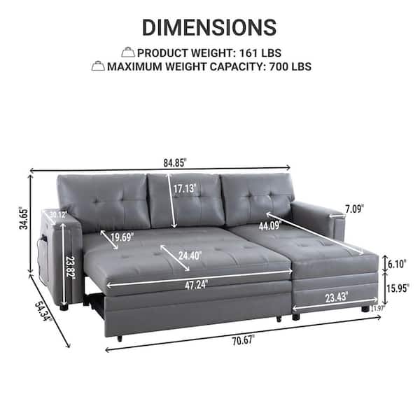 84 in. Straight Arm Air Leather Rectangle Sectional Sofa with USB Ports and Reversible Sleeper in. Gray