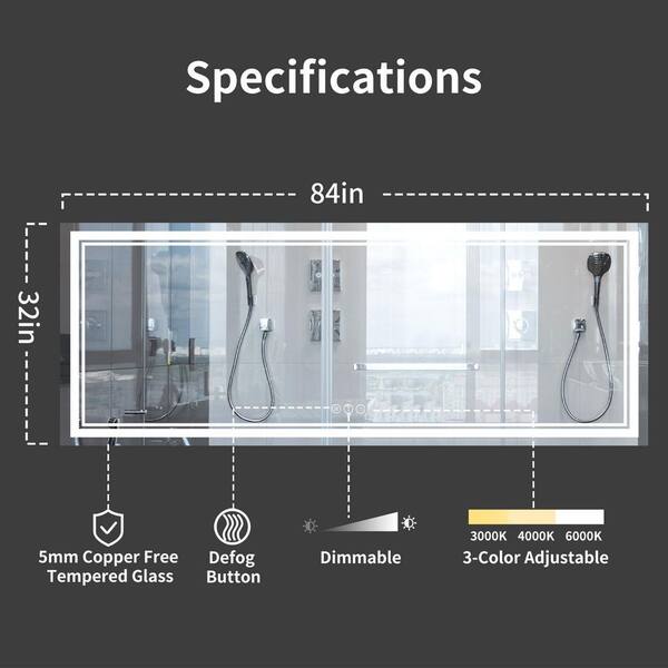 84 in. W x 32 in. H Rectangular Frameless LED Wall Mount Anti-Fog Modern Decorative Bathroom Vanity Mirror