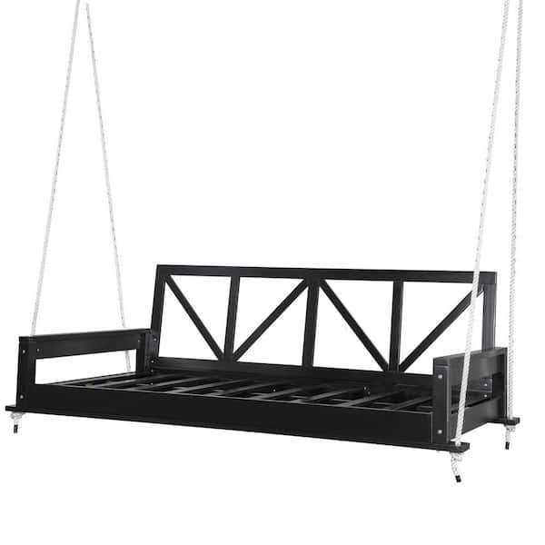 85.4 in. 3-Person Wood Porch Patio Swing Bed with 16.4 ft. Hemp Ropes in Black