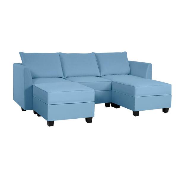 87.01 in. Linen Modular Reversible U-Shaped Sectional Sofa with Double Chaise and Ottomans, Robin Egg Blue