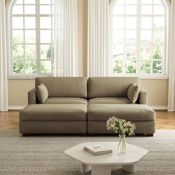 88 in. Modern Square Arm Corduroy Fabric Upholstered Sectional Sofa in Camel with 2-Ottomans and Wood Leg
