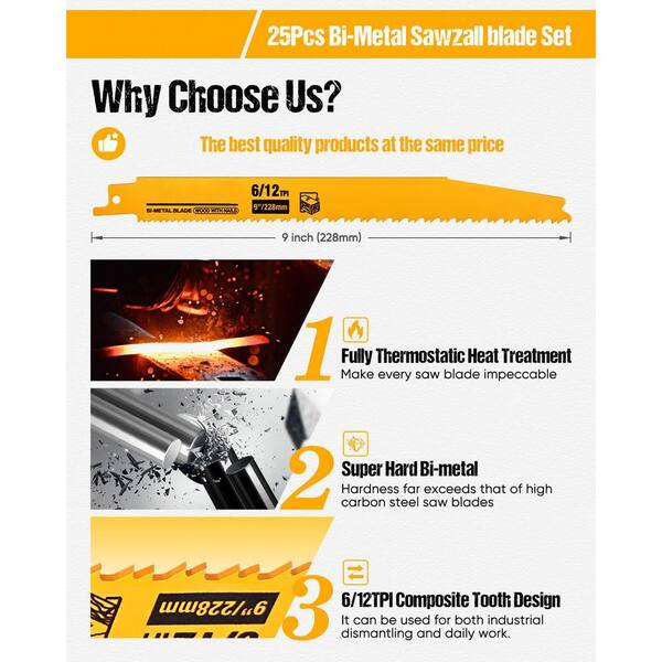 9 High-Strength Bi-Metal Reciprocating Saw Blades with Smart Tooth Design for Wood, Nail-Embedded Wood, PVC (25-Pack)