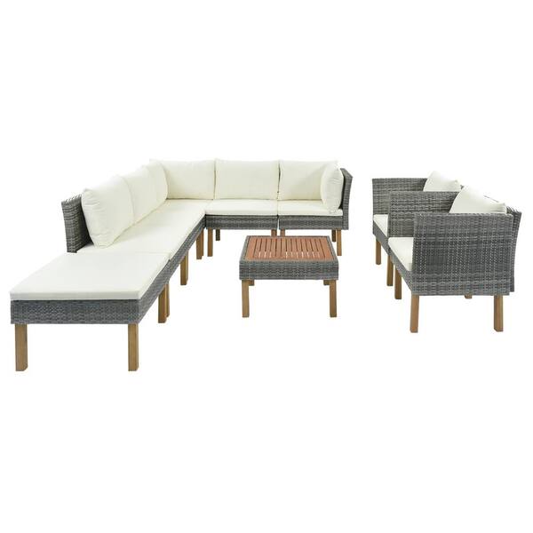 9-Piece Gray PE Rattan Wicker Patio Outdoor Sectional Sofa Set with Beige Cushion Acacia Wood Legs Tabletop Coffee Table