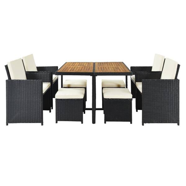 9-Piece PE Wicker Patio All-Weather Outdoor Dining Table Set with Wood Tabletop for 8, Black Rattan+Beige Cushions