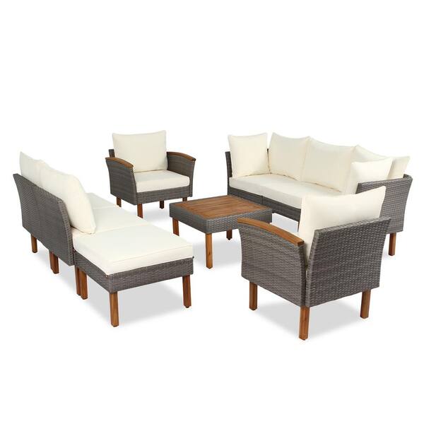 9-Piece Patio Rattan Furniture Set, Outdoor Conversation Set with Acacia Wood Legs and Coffee Table, with Beige Cushion