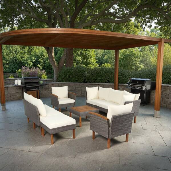 9-Piece Wicker Outdoor Sectional Sofa Set with Acacia Wood Legs, Tabletop and Beige Cushions
