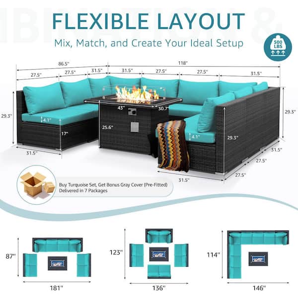 9 Pieces Gray Wicker Outdoor Sectionals Patio Furniture Set Conversation Set with Fire Pit Table and Teal Cushions