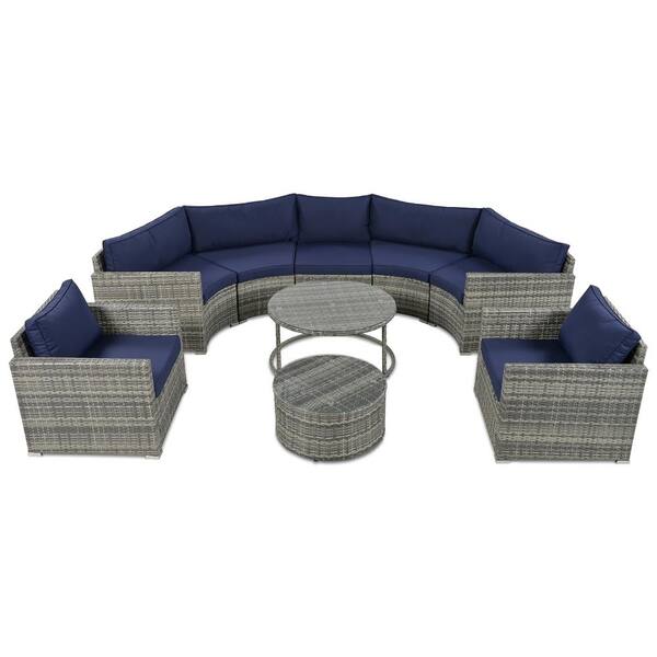9-Pieces Wicker Outdoor Half-Moon Patio Sectional Set, Modern Style Sofa Gray Wicker, with Blue Cushions and Round Table