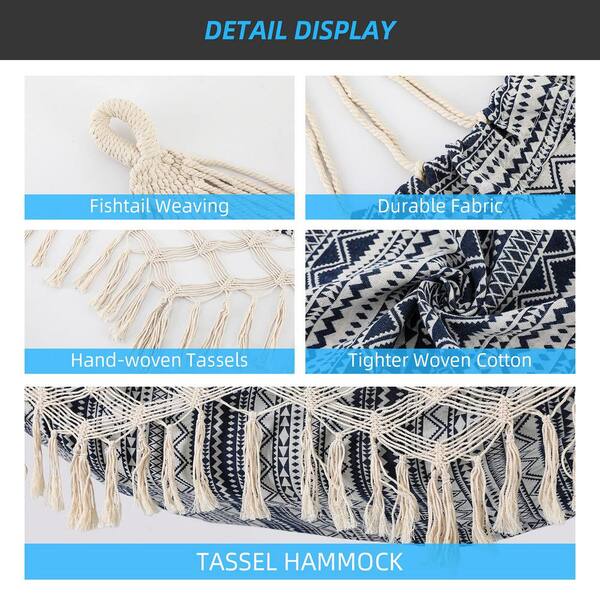 9 ft. Large Brazilian Thickened Non-Fading Cotton Fabric Portable Hammock in Blue/White with Handmade Deluxe Tassels