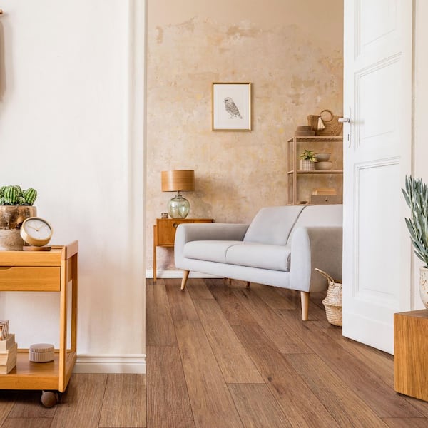 • Warm brown stair tread with wood-look grain finish
