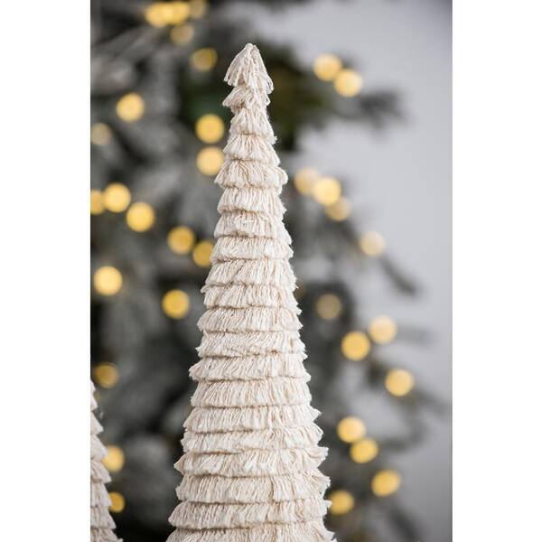 Fringes Embellished Cones with Wooden Base - Large - Set of 2 - Cream