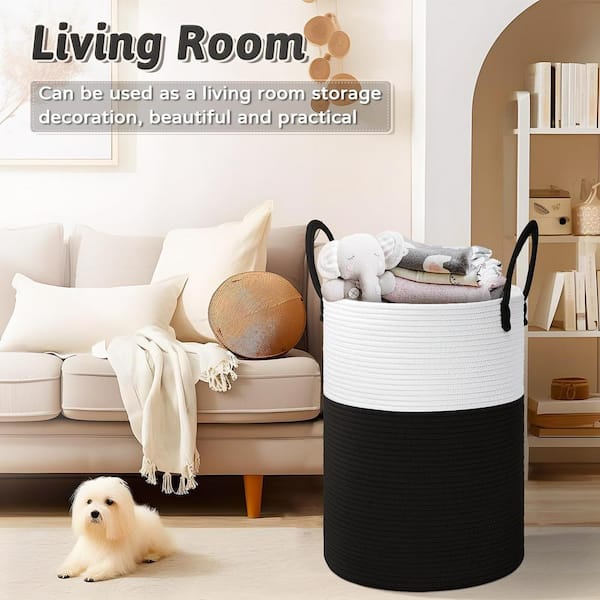 A Black 60L Woven Fabric Rope Modern Round Laundry Room Hamper