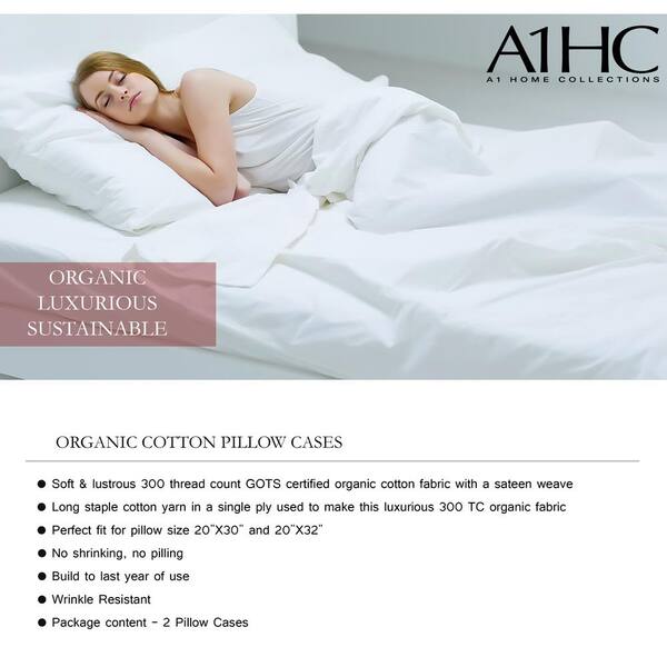 A1HC 100% Organic Cotton 300 TC Sateen White Standard/Queen Pillowcase (Set of 2)