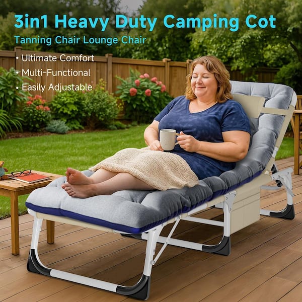 Folding Sun Tanning Chair 3 in 1 Metal Outdoor Chaise Lounge Chairs with Beige Cushions Patio Chaise Chair, 1-Piece