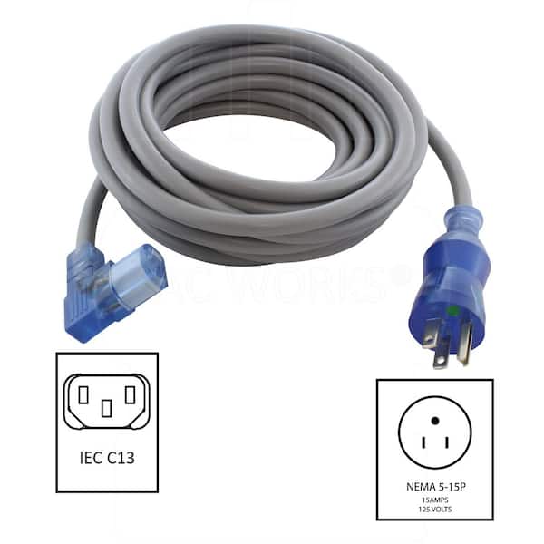 20 ft. 15 Amp 14/3 Medical Grade Power Cord with Left Angle IEC C13 Connector