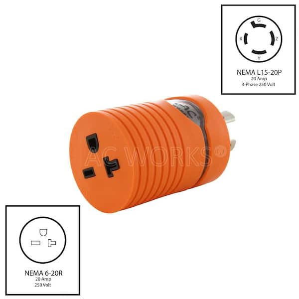 • Converts 3‑phase 4‑prong plug to 250V T‑blade outlet