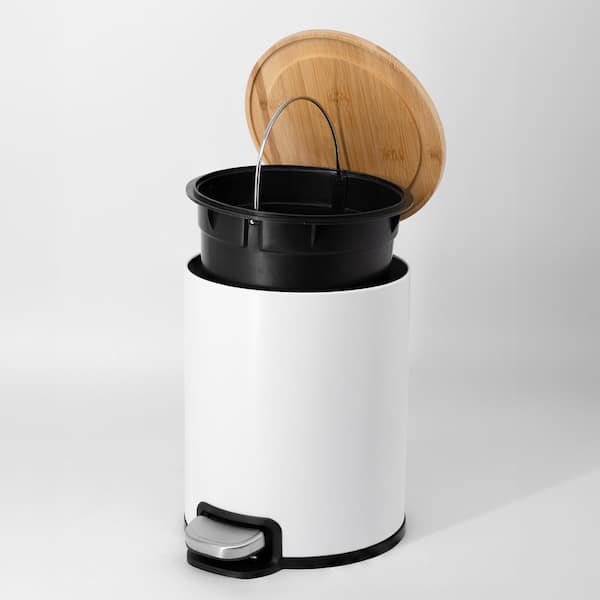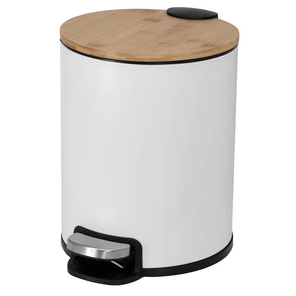 Round 5 L Pedal Trash Bin with Bamboo Soft Close Lid in White and Natural Bamboo