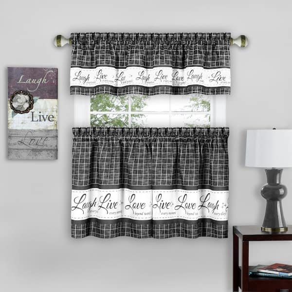 Live, Love, Laugh Charcoal Polyester Light Filtering Rod Pocket Tier and Valance Curtain Set 58 in. W x 24 in. L