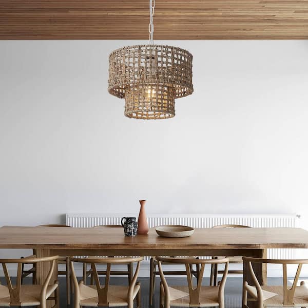 1-Light Distressed White Bohemian Hand Woven Drum Chandelier for Dining Room Kitchen Island with no bulbs included