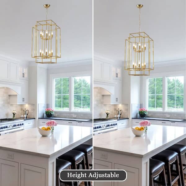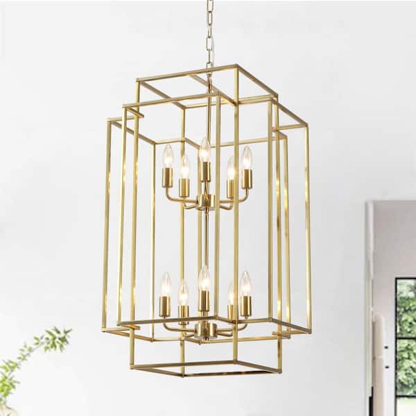 10-Light Brass Farmhouse Chandelier with Metal Lantern Shade, Candlestick Chandeliers for Dining Room