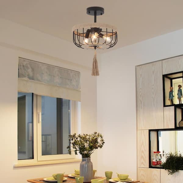 11.81 in. 3-Light Black Hemp Rope Semi Flush Mount Fixture with No Bulbs Included