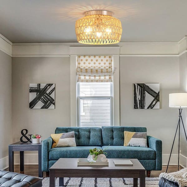 12.59 in. 3-Light Nickel Semi-Flush Mount With Hemp Ropes Shade and No Bulbs Included
