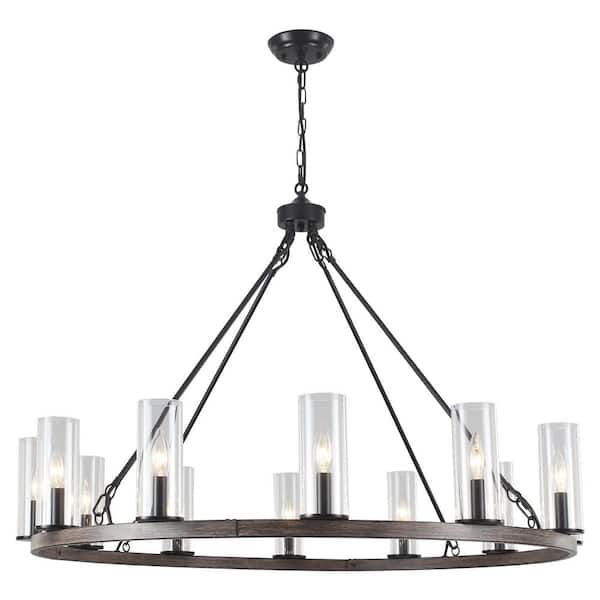 12-Light Black, Imitation Wood Grain Candle Style Wagon Wheel Chandelier Farmhouse Pendant Light with Clear Glass Shade