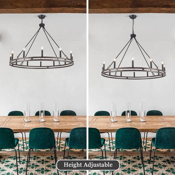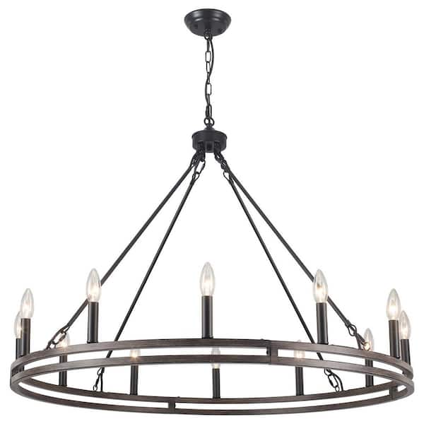 12-Light Black and Imitation Wood Grain Candle Style Wagon Wheel Chandelier Dimmable Pendant Light