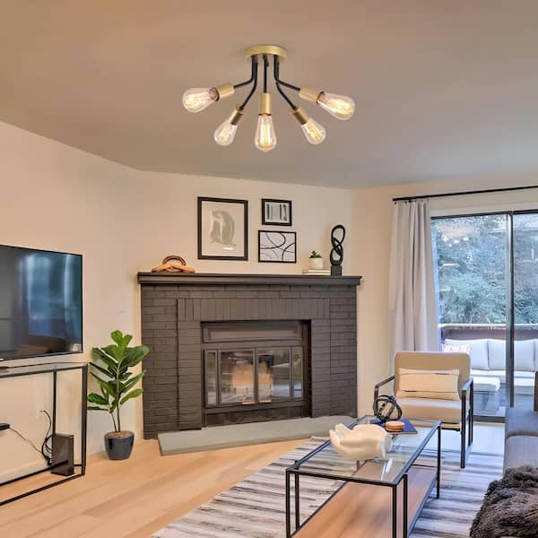 14.76 in. 5-Light Black and Gold Modern Sputnik Linear Semi- Flush Mount Ceiling Light Chandeliers for Bedrooms