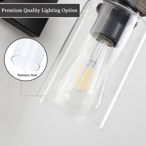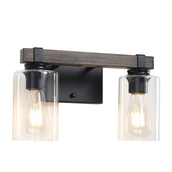 14.96 in. 2-Light Black and Imitation Wood Grain Bathroom Vanity Light with Clear Glass Shades