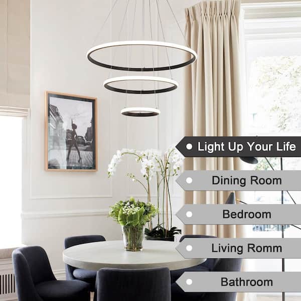 23.6 in. 3-Light Black Modern Dimmable LED Chandelier Height Adjustable Hanging Circular Pendant Light