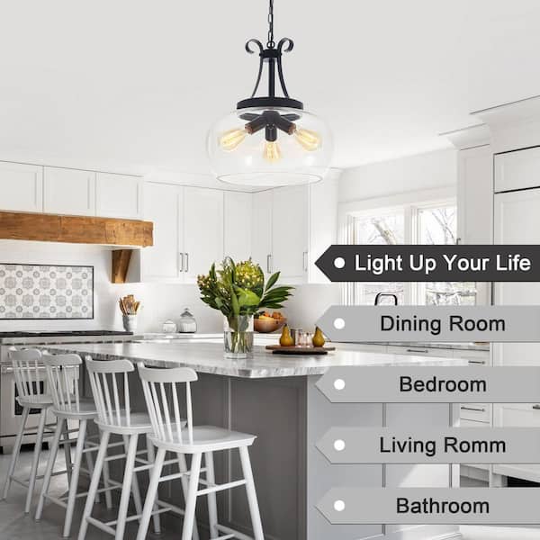 3-Light Mid-Century Modern Matte Black Pendant Light with Clear Glass Shade