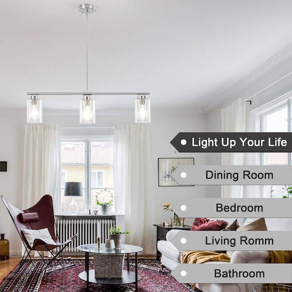 3-Light Sand Nickel Industrial Linear Chandelier with Clear Glass Shades