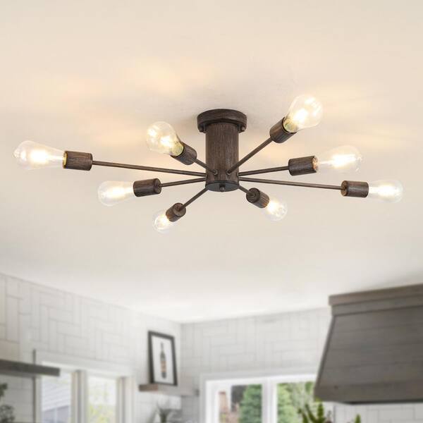 30.12 in. 8-Light Imitation Wood Grain Linear Semi-Flush Mount Light Sputnik Ceiling Light for Dining Room