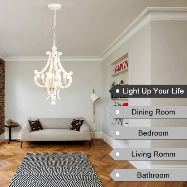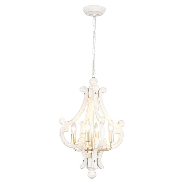 4-Light Imitation Copper and Gold Farmhouse Chandelier Rustic White Shade Wood Light Fixture Cage Pendant Lighting