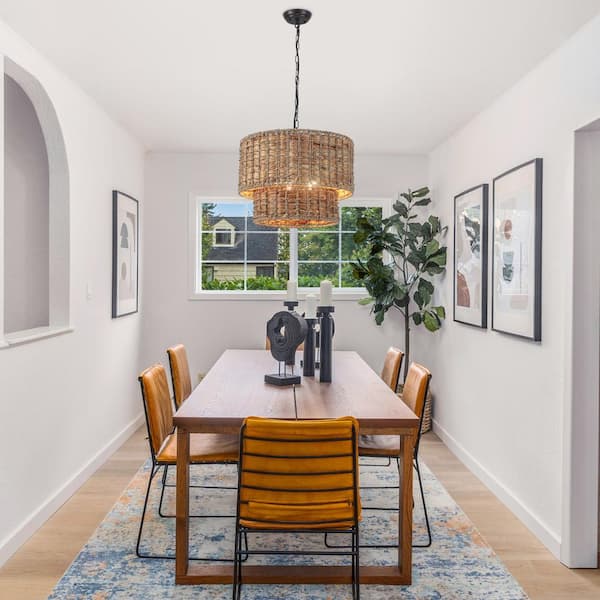 5 - Light 2-Tier Black Drum Rattan Dimmable Chandelier Light for Kitchen Island,Dining Room with No Bulbs Included