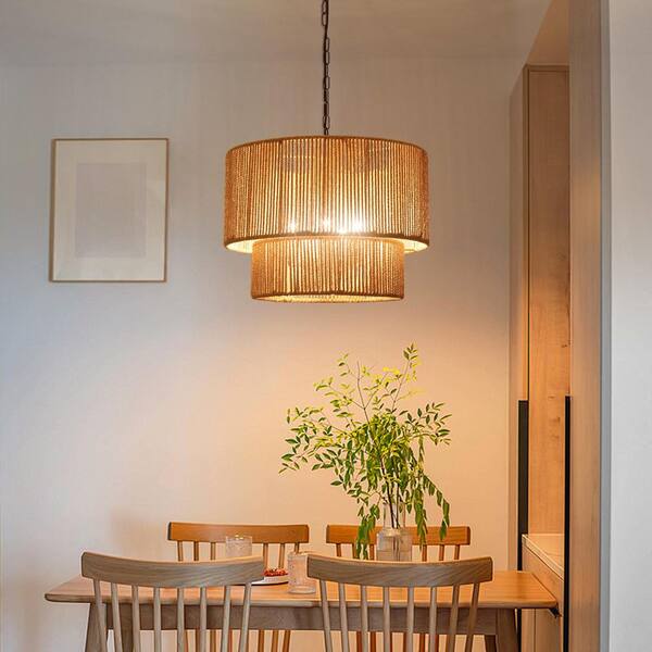 5 Light 2-Tier Black Drum Rattan Dimmable Chandelier for Kitchen Island with No Bulbs Included