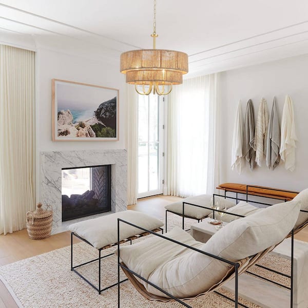 5 Light 2-Tier Gold Drum Rattan Hemp Ropes Chandelier for Living Bedroom Room with No Bulbs Included