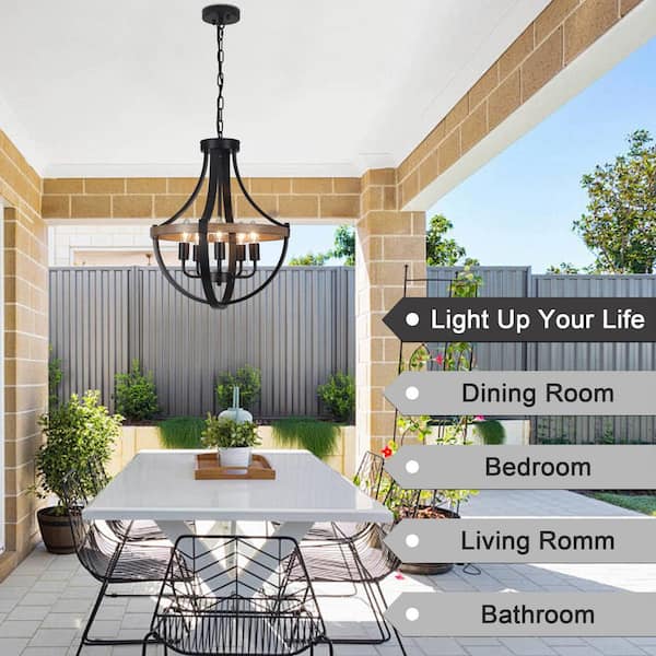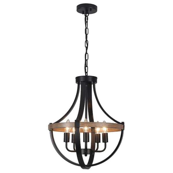 5-Light Black and Imitation Wood Grain Industrial Chandelier Light Fixture for Living Room, Dining Room