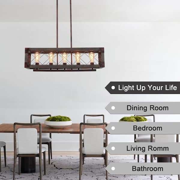 5-Light Red Rust and Smoked Wood Farmhouse Rectangular Chandelier Adjustable Hanging Length Kitchen Island Pendant Light