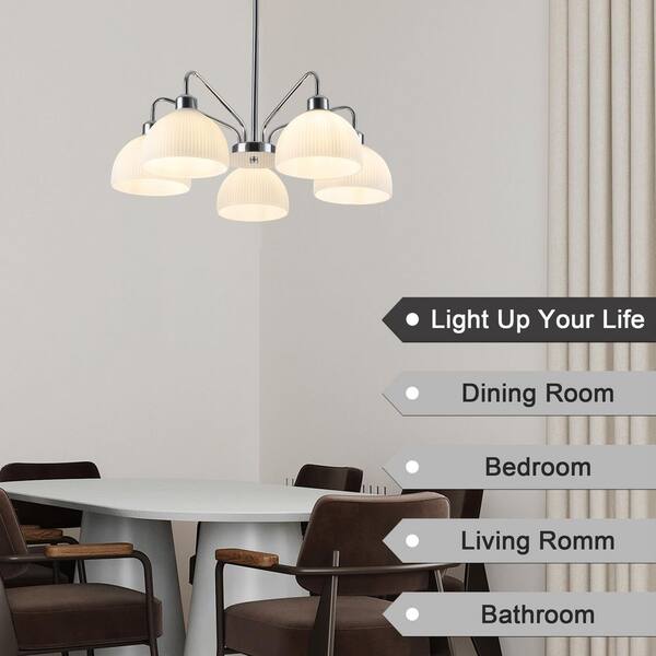 5-Light Silver Transitional Chandelier with White Glass Shades for Dining Room