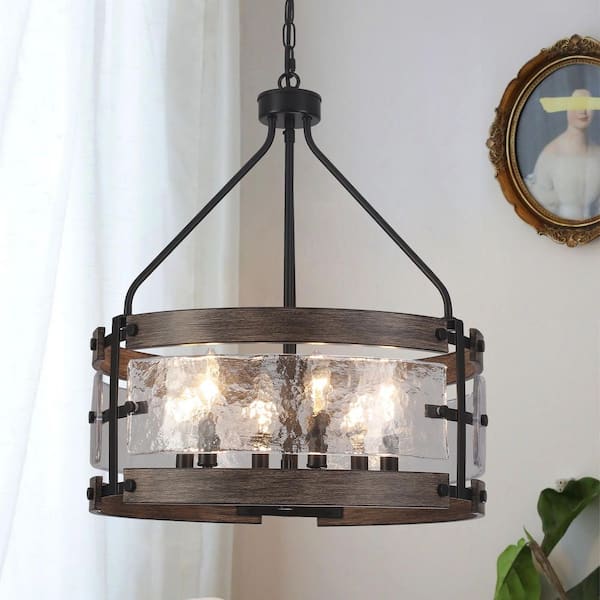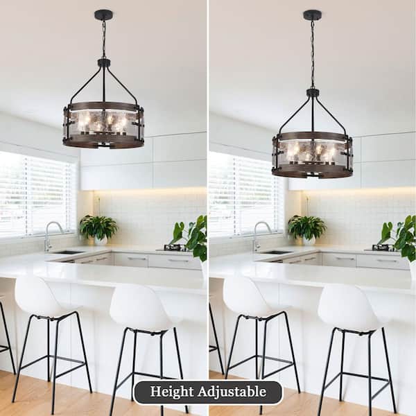 6-Light Black and Imitation Wood Grain Farmhouse Candle Chandelier, Adjustable Height Pendant Light