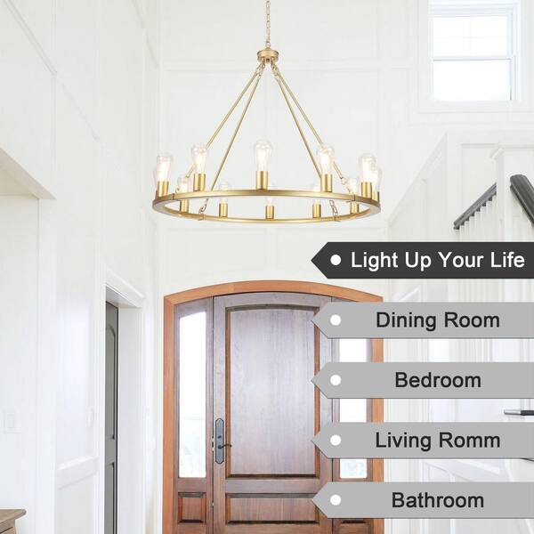 60-Watt 12-Light Gold Farmhouse Wagon Wheel Chandelier, No Bulb Included