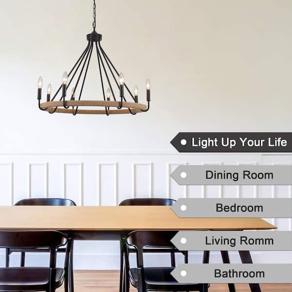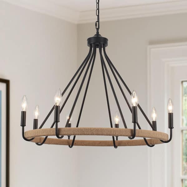 8-Light Black and Brown Farmhouse Hemp Rope Wagon Wheel Chandelier for Living Room