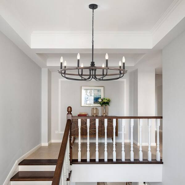 8-Light Brown/Black Dimmable Candle Style Round Wagon Wheel Chandelier for Kitchen Island with No Bulbs Included