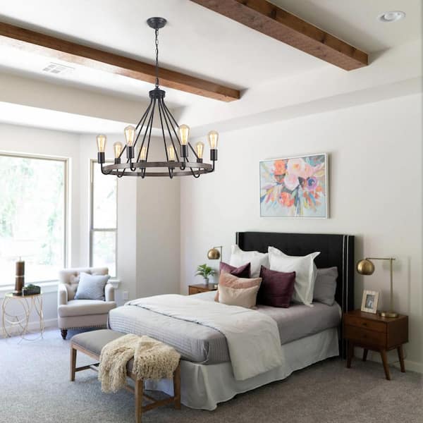 8-Light Brown/Black Rustic Farmhouse Candle Style Wagon Wheel Chandelier for Dining Room with no Bulbs Included