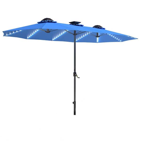 15 ft. Outdoor Large Double Market Patio Umbrella with Solar Lights, LED Lights and Crank Handle in Dark Blue
