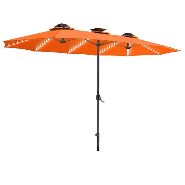 15 ft. Outdoor Large Double Market Patio Umbrella with Solar Lights, LED Lights and Crank Handle in Orange